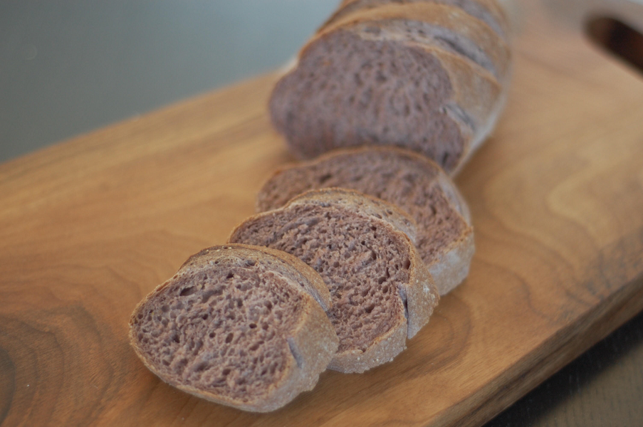アルコールを軽くとばした赤ワインを仕込水にした食事パンです。